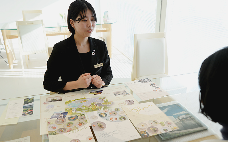 フォトウエディングや挙式・披露宴を考えられているお客様のご相談を受けたり、当式場のご紹介をしています。結婚式を挙げようとご決断くださったお客様が当日を迎えるまで、密にサポートさせていただいております。